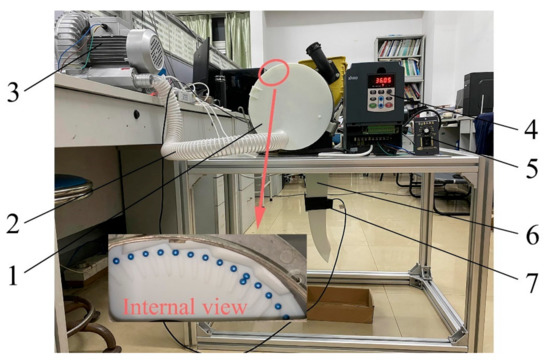 Seeding performance experimental device: (1) Air-suction seed-metering device; (2) pneumatic tube; (3) vortex air pump; (4) frequency converter; (5) governor; (6) seed guide tube; (7) laser sensor.