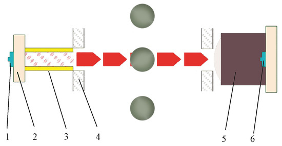 Laser sensor monitoring model: (1) modulation tube; (2) circuit board; (3) laser emission tube; (4) transparent plate; (5) lens; (6) receiving tube.