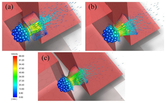Velocity vector diagram of the suction hole fluid domain. (a) A; (b) B; (c) C.