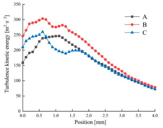 Turbulent kinetic energy is the carrier that reflects the magnitude of turbulent pulsation energy [28]. Assessment of the turbulent kinetic energy of the suction hole axis line allowed for further analysis of the variation of turbulent kinetic energy inside the suction holes with different structures. The turbulent kinetic energy variation of the suction hole axis line is shown in Figure 13. The overall turbulent kinetic energy on the axis line of the B-type suction hole was larger compared to that of the A-type and C-type suction holes (Figure 13). This means that the kinetic energy of the sub-particles around the inlet flow field of the B-type suction hole is larger. Since the kinetic energy between the sub-particles is transferred through the cohesive bond, it can be deduced that the adsorption effect of the seeds in the B-type suction hole was the best under the same boundary conditions.