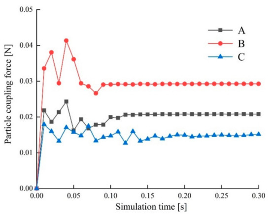 The main basis for quality evaluation of the suction hole structure is the coupling force of the suction hole on the seed. The EDEM post-processing tool was employed to derive the coupling force on the seed particles along the axis of the suction hole, as shown in Figure 14. Figure 14 shows that when the seed particles are stably adsorbed to the suction holes (after 0.2 s of coupling simulation), the coupling force of the C-type suction hole to the seed particles is the smallest, with an average of 0.015 N, while the coupling force of the B-type suction hole to the seed particles is the largest, with an average of 0.029 N. The B-type suction hole structure demonstrates relatively upstanding seed suction performance in the turbulent kinetic energy and particle coupling force. Therefore, in designing the suction hole structure of the seed-metering plate, the suction hole structure in the form of the B-type is preferred to ensure more effective and stable seed adsorption by the seed-metering device.