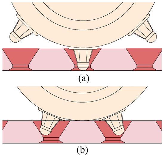 By smoothly ejecting the impurities or seeds on the front surface of the seed-metering plate, one becomes certain that the knock-out wheel tooth is inserted into the suction hole on the rear surface of the seed-metering plate. The spherical design is adopted to increase the tooth top height to 4 mm. The design of the tooth profile of the knock-out wheel matched the B-type suction hole (Figure 15). The knock-out wheel was rotated clockwise by half of the included angle between adjacent teeth (22.5°). As demonstrated in Figure 15a,b, the knock-out wheel teeth do not interfere with the suction hole at the beginning and end of the meshing position. This is a preliminary verification of the rationality of the designed knock-out wheel tooth profile.