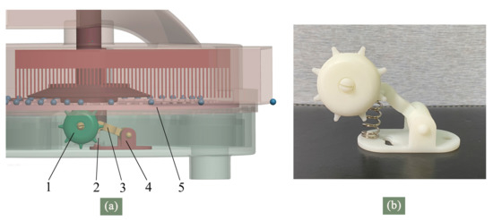 The Adams Post-Processor was employed to determine the force between the knock-out wheel teeth and the suction hole within 0~1 s and explore the meshing performance between them. Figure 16 shows the force variation curve during the meshing process. It is notable that the meshing force curve escalated rapidly in a short time and then fluctuated periodically (Figure 16a). In the initial stage, the gear teeth of the knock-out wheel were tangent to the suction hole of the seed-metering plate, with no contact between the gear teeth and the internal structure of the suction hole. Subsequently, the angular velocity of the seed-metering plate increased from 0 rad/s to 2.09 rad/s instantaneously, which caused a larger impact force, instantaneously increasing the meshing force to a larger value. In addition, before the 0.1 s stage, an increase in load torque continuously increased the meshing force between the gear teeth and the suction hole with notable fluctuations. After the 0.1 s stage, the load torque attained a predetermined value, and the meshing force between the gear teeth and the suction hole seized increased. As such, the fluctuation trend began to show a stable periodic state. The fluctuation period of the meshing force was calculated as 0.05 s using the ADMAS Post-Processor module, which concurred with the theoretical meshing period calculated in Section 2.3.2. The radial force gradually increased with the increase in the load torque and fluctuated periodically after 0.1 s (Figure 16b), similar to the overall variation of the meshing force. Of note, the variation of the radial force reflects the periodic force of the gear teeth relative to the suction hole in the vertical direction. Therefore, increasing the meshing stability between the gear teeth and the suction hole required the installation of a spring in the vertical direction and the use of spring force to improve the negative impact due to the periodically fluctuating radial force. As demonstrated in Figure 16c, the periodic change trend of the axial force was similar to the radial force, but the value was relatively small, providing evidence that the knock-out wheel was also subject to certain periodic impacts on the axial direction during the meshing process. The knock-out wheel was designed to be slidable in the axial direction to alleviate the impact force along the axial direction of the knock-out wheel during the meshing process. This subsequently improved the negative impact of the axial periodic impact on the knock-out wheel. In this view, a seed-unloading mechanism was designed (Figure 17).