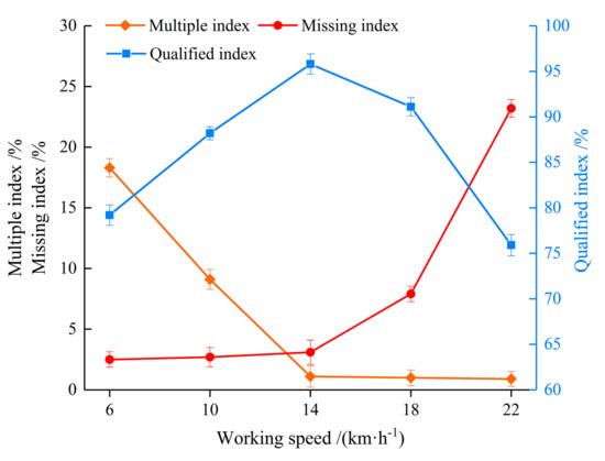 As demonstrated in Figure 18, the qualified index shows a trend of first increasing and then decreasing with an increase in working speed. On the other hand, the multiple index shows a gradually decreasing trend, and the missing index shows a gradually increasing trend. At a 6 km/h working speed, the multiple index is the highest and the missing index is the lowest. To explain this, a low rotation speed of the seed-metering plate results in a prolonged stay of the suction hole in the seed-filling area. As such, there is sufficient time for seeds to be adsorbed by the suction hole. With the increase in the rotation speed of the seed-metering plate, the qualified index gradually increased, the multiple index also decreased sharply, and the missing index showed a slow upward trend as a whole. These observations are because an increase in the rotation speed of the seed-metering plate improved the dispersion of seed groups. As a result, the probability of the suction holes to absorb seeds increased, reducing the negative impact of the higher multiple index caused by the increase in the rotation speed of the seed-metering plate. When the working speed is too high, the residence time of the suction holes in the seed-filling area becomes too short. In this regard, some seeds cannot be adsorbed in a timely manner by the suction holes, which then increases the missed seeding phenomenon and decreases the qualified index.