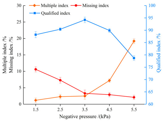 To analyze the influence of negative pressure on various experimental indicators, a seed-throwing angle of 20° and a working speed of 14 km/h were selected. In this regard, five levels of negative pressure, 1.5 kPa, 2.5 kPa, 3.5 kPa, 4.5 kPa, and 5.5 kPa, were selected, and three experiments were performed on each level. The variation law of the seeding performance evaluation index with the negative pressure was obtained by analyzing the experimental results (Figure 19).