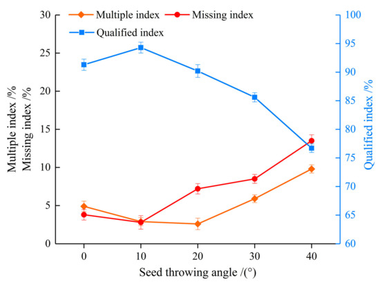As demonstrated in Figure 20, a seed-throwing angle within the range of 0–20° resulted in a qualified index of no less than 90%, a missing index of no higher than 7.2%, and a multiple index of no higher than 2.6%. With the increase in the seed-throwing angle, the qualified index first increases rapidly and then decreases sharply after reaching the highest point. At a 10° seed-throwing angle, the qualified index rises to the highest point at 94.3%. However, the qualified index drops to the lowest, at 76.7%, when the seed-throwing angle is 40°. SPSS software was employed to process the results of the above-mentioned one-factor experiments. Results of ANOVA of the influence of seed-throwing angle on the seeding performance evaluation indicators are shown in Table 6. It is notable that the seed-throwing angle extremely significantly influences each seeding performance indicator, and a reasonable value range of the seed-throwing angle is 0–30°.