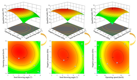 The RSM results of the influence of experimental factors on the qualified index revealed that the working speed is the main influencing factor on the qualified index in the interaction of the working speed with the negative pressure. Moreover, the working speed is the main influencing factor on the qualified index in the interaction of the working speed with the seed-throwing angle. Lastly, the seed-throwing angle is the main influencing factor on the qualified index in the interaction of the seed-throwing angle with the negative pressure.