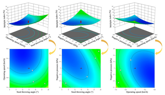 The response surface and the corresponding projection contour of the influence of experimental factors on the multiple index are shown in Figure 22. According to the results of the influence of experimental factors on the multiple index (), the following observations were made: (i) At a seed-throwing angle of 15° and a constant working speed, the multiple index decreases first and then increases with increasing negative pressure, and the optimal range of the negative pressure is 2.1–3.9 kPa. (ii) At a seed-throwing angle of 15° and constant negative pressure, the multiple index demonstrates a gradually decreasing trend with the increase in the working speed, and the optimal range of the working speed is 13.6~16.4 km/h. (ii) At a working speed of 14 km/h and a constant seed-throwing angle, the multiple index decreases first and then increases with increasing negative pressure, and the optimal range of the negative pressure is 2.4–3.9 kPa. (iv) At a working speed of 14 km/h and constant negative pressure, the multiple index decreases first and then increases with an increasing seed-throwing angle, and the optimal range of the seed-throwing angle is 6–19°. (v) At a negative pressure of 3 kPa and a constant seed-throwing angle, the multiple index shows a gradually decreasing trend with the increase in the working speed, and the optimal range of the working speed is 13.8–16.0 km/h. (vi) At a negative pressure of 3 kPa and a constant working speed, the multiple index shows an overall increasing trend with the increase in the seed-throwing angle, and the optimal range of the seed-throwing angle is 6–20°.