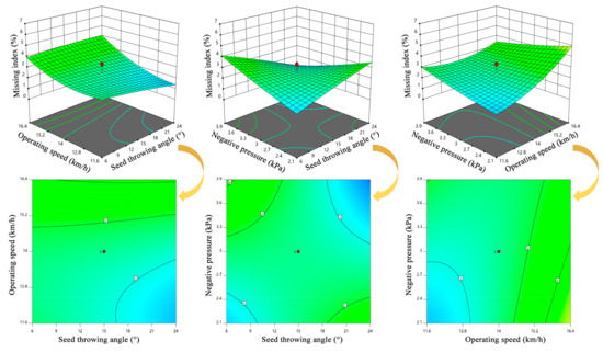 The RSM results of the influence of experimental factors on the missing index showed that the working speed is the main factor affecting the missing index in the interaction between the working speed and the negative pressure. In addition, the working speed is the main influencing factor on the missing index in the interaction between the working speed and the seed-throwing angle. Lastly, the seed-throwing angle is the main influencing factor on the missing index in the interaction between the seed-throwing angle and negative pressure.