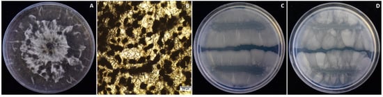 Isolates from strawberry plants. Macrophomina phaseolina FDe13MX (A) on PDA at 30 °C for 5 days, microsclerotia from M. phaseolina FDe13MX (B) observed under light microscopy (scale bar 200 µm), Bacillus amyloliquefaciens BsA3MX (C), and B. amyloliquefaciens BsC11MX (D) grown on TSA at 30 °C for 5 days. Bacteria were streaked on two transversal lines in the petri dish.