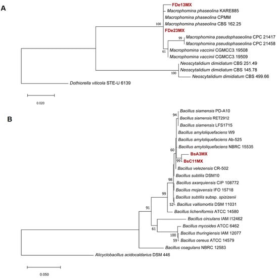 Amplification reactions were carried out in a Bio-Rad T-100 thermal cycler (Bio-Rad, Hercules, CA, USA) set to the following conditions. For ITS region, an initial step of 94 °C for 2 min, followed by 35 cycles of 94 °C for 1 min, 58 °C for 1 min, and 72 °C for 1.5 min; for tef-1α, an initial step of 95 °C for 3 min, followed by 35 cycles of 95 °C for 30 s, 55 °C for 30 s, and 72 °C for 1 min; for 16S rRNA region, an initial step of 95 °C for 2 min, followed by 35 cycles of 95 °C for 30 s, 55 °C for 1 min, and 72 °C for 1.5 min. All programs ended with a final cycle of 72 °C for 10 min. PCR reactions were purified using a GeneJet PCR purification kit (Thermo Scientific, Waltham, MA, USA) and sequenced. The sequences were analyzed using BioEdit Sequence Alignment Editor and deposited in the National Center for Biotechnollogy Information GenBankFor bacterial phylogenetic analysis, a nucleotide Basic Local Alignment Search Tool (BLASTn) was performed against the GenBank 16S Ribosomal RNA sequences database, and those with the highest similarity for each phylogenetic marker were used (Tables S1 and S2) to construct the alignment using ClustalW. In the case of fungal isolates, the analysis was performed using a concatenated sequence alignment of ITS and tef-1α. Maximum Likelihood (ML) and Maximum Parsimony (MP) analyses were performed using Molecular Evolutionary Genetics Analysis (MEGA-X) software with Bootstrap values based on 1000 replicates. Gaps were treated as missing data. The tree was visualized in MX: Tree Explorer [38].