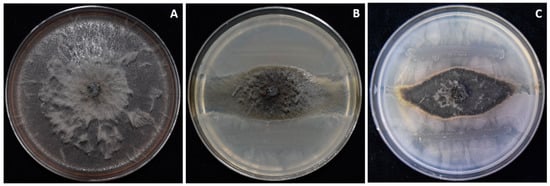Antagonism assay on PDA at 30 °C for 5 days of incubation. Macrophomina phaseolina FDe13MX (A), M. phaseolina FDe13MX + B. amyloliquefaciens BsA3MX (B), and M. phaseolina FDe13MX + B. amyloliquefaciens BsC11MX (C).