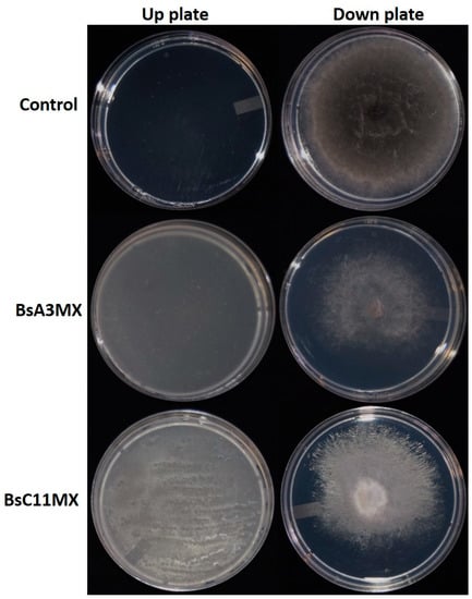 Effect on Macrophomina phaseolina of volatile organic compounds produced by isolates of Bacillus amyloliquefaciens on PDA at 30 °C for 5 days. In the control plates, M. phaseolina FDe13MX was inoculated only in the down plate. Bacterial isolates BsA3MX and BsC11MX were inoculated in an up plate facing M. phaseolina FDe13MX in the down plate.