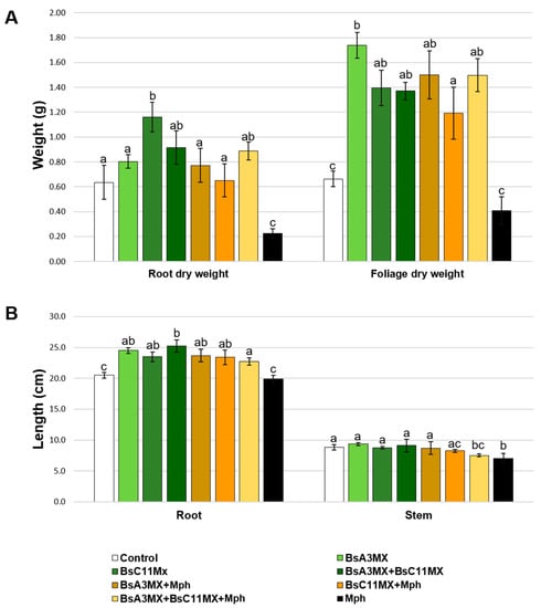 Effect of the inoculation of B. amyloliquefaciens isolates BsC11MX and BsA3MX in cowpea plants. Root and foliage dry weight (A), and root and stem length of cowpea plants (B) after two months of bacteria and fungus inoculation. Mph: M. phaseolina FDe13MX. Bars indicate standard deviations. Means accompanied by the same letters are not significantly different (α < 0.05).