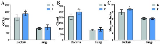 Effect of the fungicide prochloraz on bacterial and fungal community diversity in bayberry rhizosphere soil. (A) OTU distribution; (B) Chao1 diversity indexes; (C) Shannon diversity index. D and P represent decline disease alone and in combination with the fungicide prochloraz, respectively. * on the column indicates that the same parameter of the treatment is significantly larger than that of the control (p < 0.05).
