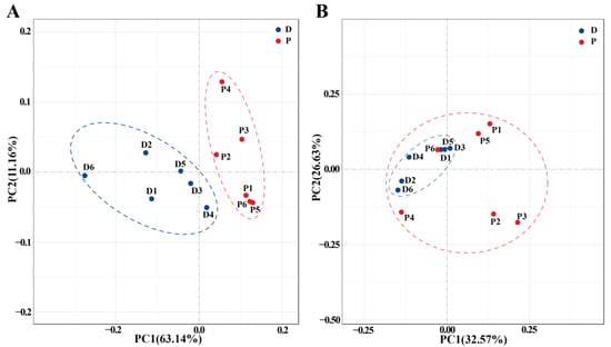 Effect of the fungicide prochloraz on soil microbial OTU abundance based on PCoA. (A) Bacteria; (B) Fungi. D and P represent decline-diseased trees alone or in combination with the fungicide prochloraz, respectively.