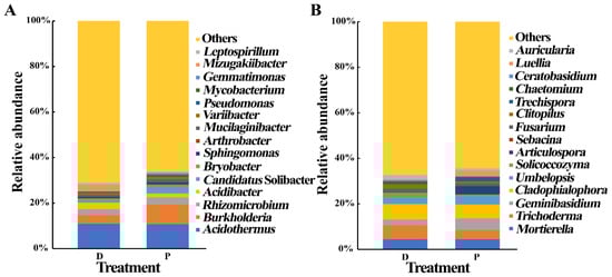 Effect of the fungicide prochloraz on the relative microbial abundance of bayberry rhizosphere soil at the genus level. (A) Bacteria; (B) Fungi. D and P represent decline-diseased trees only and in combination with the fungicide prochloraz, respectively.