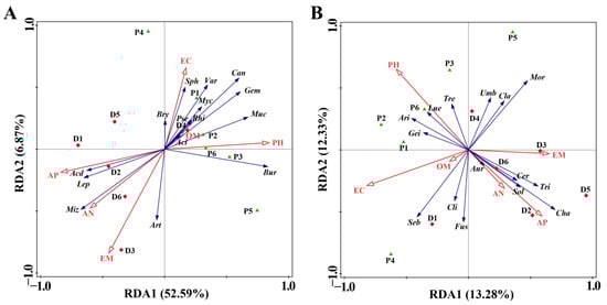 Redundancy discriminant analysis (RDA) of microbial community composition in rhizosphere soil at genus levels. (A) Bacteria; (B) Fungi. The red diamond and green up triangle icons represent samples from decline-diseased bayberry alone (D) and disease in combination with prochloraz (P). PH (pH); OM (organic matter); AN (alkali-hydrolyzable nitrogen); AP (available phosphorus); EC (exchangeable calcium); EM (exchangeable magnesium); Acd (Acidibacter); Aci (Acidothermusl); Ari (Articulospora); Art (Arthrobacter); Aur (Auricularia); Bry (Bryobacter); Bur (Burkholderia); Can (Candidatus solibacter); Cer (Ceratobasidium); Cha (Chaetomium); Cla (Cladophialophora); Cli (Clitopilus); Fus (Fusarium); Gem (Gemmatimonas); Gmi (Geminibasidium); Lep (Leptospirillum); Lue (Luellia); Miz (Mizugakiibacter); Mor (Mortierella); Muc (Mucilaginibacter); Myc (Mycobacterium); Pse (Pseudomonas); Rhi (Rhizomicrobium); Seb (Sebacina); Sol (Solicoccozyma); Sph (Sphingomonas); Tre (Trechispora); Tri (Trichoderma); Umb (Umbelopsis); Var (Variibacter).