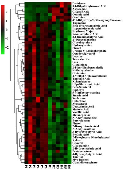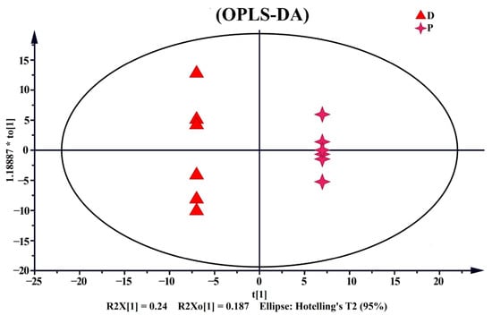 In this study, we identified a total of 223 metabonomics through the GC-MS analysis of rhizospheric soils from the diseased control and prochloraz treatment groups. Indeed, a metabolite score map was obtained (Figure 5) by applying the “orthogonal partial least squares discriminant analysis (OPLS-DA)”, which has been considered as a controlled statistical method for the analysis of discriminants [5,24]. Thus, metabonomics could be effectively separated between D and P. The analysis of the differences between the treatments showed that the six sample points of D and P were dispersed in the negative and positive areas of t(1), respectively (Figure 5). The results show that the model values of D and P were R2X (cum) = 0.592, R2Y (cum)= 1, and Q2 (cum)= 0.994, while the R2 value was 0.772 and the Q2 value was 0.994. The Q2 and R2 values (>0.5) showed that the model had a good interpretation and prediction ability, as the R2 values were >0.5. The cluster separation effect of D and P indicated that the application of prochloraz fungicide significantly changed the metabolic structure of the rhizosphere soil of decline-diseased bayberry.