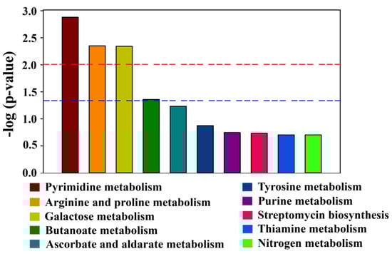 The results of this study showed that D and P differed in four metabolic pathways, including pyrimidine metabolism (p < 0.01), arginine and proline metabolism (p < 0.01), galactose metabolism (p < 0.01), and butanoate metabolism (p < 0.05), based on a pathway enrichment analysis of various secondary metabolites based on the “KEGG (Kyoto Encyclopedia of Genes and Genomes) database” (Figure 7). The results showed that the application of prochloraz improved the content of metabolites, promoting metabolic function and that amino acid metabolism and sugar metabolism were the key metabolic pathways of the differential metabolites between the diseased trees and the rhizosphere soil treated with prochloraz.