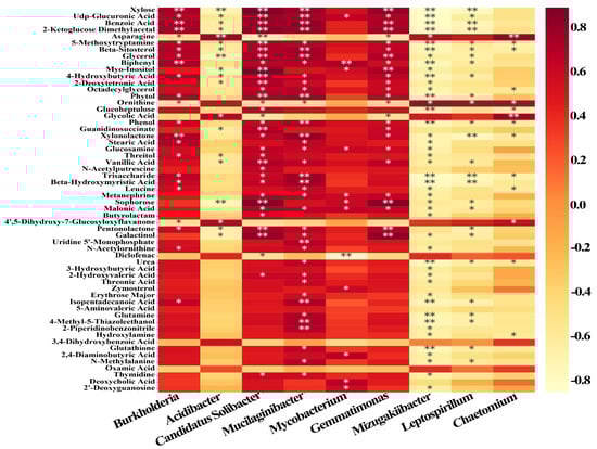 Correlation analysis between the relative abundances of the soil microbiota at the genus level and the metabolite relative contents in the fungicide prochloraz treatment. * and ** mean significance at p < 0.05 and p < 0.01, respectively. The depth of the orange scale indicates the magnitude of the correlation coefficient; the lighter the color is, the greater the negative correlation is, while the darker color is, the greater the positive correlation is.