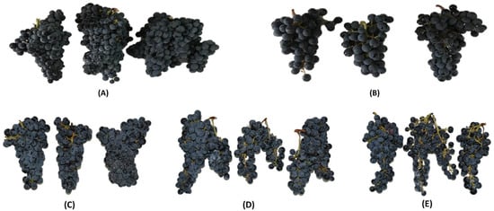 Visual appearance of bunches for each experiment: (A) compact bunch, (B) non-compact bunch, (C) control, (D) 25% Berry thinning method, and (E) 50% berry thinning method.