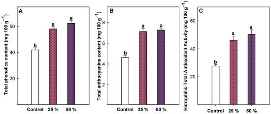 On the other hand, the content of bioactive compounds, namely, total phenolics and total anthocyanins, increased after reducing the bunch compactness of ‘Monastrell’ wine grape (Table 1 and Figure 2). Similarly, other reports have concluded that wine grapes or wines made with berries from bunches that have been treated with berry thinning methods increase the content of total phenolics compounds [], as well as total flavonols concentration []. Regarding the effect of sun exposure on the increase in flavonol content [,,], berries from clusters thinned by 25% and 50% could have a higher content of total phenolics due to those berries receiving more sunlight, since the bunch compactness and the shadowing effect are lower compared with the control bunches. In this sense, a higher phenolic content on wine grapes could increase the possibility of copigmentation effects on its subsequent wine, which could enhance the redness color and the purplish nuances of the red []. Furthermore, color heterogeneity increases in compact bunches because they bear more inner berries that receive little sun exposure and more heat [], which is unbeneficial to improve the biosynthesis and accumulation of secondary metabolites in the skin and flesh of berries [], especially the accumulation of total anthocyanins [,]. Our results show that total anthocyanins content was significantly higher in berries from 25% and 50% berry thinning methods than the control (Figure 2), although no significant differences were observed among the two percentages assayed. Therefore, color accumulation of the berry skin was deeper in those bunches where the two methods were performed, since those bunches would present more solar radiation and efficient aeration. Recently, one previous study indicated that reducing bunch compactness significantly increased the content of individual anthocyanins, mainly petunidin derivatives, at harvest []. On the other hand, Gil et al. [] also observed a significantly higher proanthocyanidin concentration in berry-thinning wine than control wines. In addition, the responses to bunch compactness might result from F3′H and F3′5′H transcript abundance, which can regulate the key enzymes involved in the production of the shared precursors for biosynthesis of individual anthocyanins [,]. Nevertheless, further studies are still necessary to elucidate the impact of bunch compactness and berry thinning methods on anthocyanin metabolism. In general, the improvement of the functional content observed by both methods resulted in an increase in the HTAA, since phenolic compounds, mainly anthocyanins, are hydrophilic antioxidants metabolites (Figure 2). This fact has been reported for the first time in the present study.