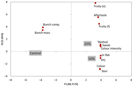 For better understanding of the relationships among the twelve statistically significant variables studied for the wine grapes and wines, a PCA (linear dimensionality reduction method for processing of multivariate data) was conducted to project the samples depending on the instrumental and sensory parameters applied to the experimental results (Figure 3). This statistical test was run for all samples including the only significantly different variables: bunch compactness, bunch mass, total anthocyanins content, hydrophilic total antioxidant activity, total phenolics content, color, color intensity, fruity (odor and flavor), sweet, sour, and aftertaste (Figure 3). The PCA explained analytical variables in two axes, F1 (92.71%) and F2 (7.29%). The results explained, easily, that functional properties of wine grape, as well as the main sensory attributes of wine, can be improved with berry thinning methods (25% and 50%) as can be seen in the differences between the control and both methods along the F1-axis. All the sensory attributes in which significant differences were found (color, color intensity, fruity, sweet, sour, and aftertaste) appear grouped with the wine samples in which a berry reduction (25% and 50%) was applied. Similarly, it can be seen in the functional determinations (total anthocyanins content, hydrophilic total antioxidant activity, and total phenolics content).