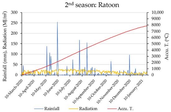 Variation in daily rainfall (mm), accumulated temperature (Accu. T), and radiation (MJ/m2) of two crop seasons in the experimental site.