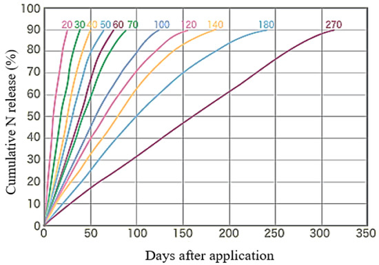 CRFs have different release patterns (linear or sigmoidal) based on the percentage of nutrient released at room temperature within a given time period; i.e., at a temperature of 25 °C, the nutrient release rate of CRF should not exceed 15% in 24 h or 75% in 28 days, or at least 75% should be released at the defined release time for the fertilizer (B. Cloth, as cited in Trenkel [40]). Different linear release patterns of CRF between 20 and 270 days at 25 °C issued by the fertilizer company are shown in Figure 3. “Tsuihimaijin”, the CRF used for the study, exhibits linear nutrient release for 140 days at 25 °C (shown in Figure 3 by the orange line corresponding to 140 days after application). In total, 53% of N included in Tsuihimaijin is incorporated as (NH4)2SO4, and 47% of N (in the form of urea) is coated. Thus, the application of Tsuihimaijin in sugarcane fields facilitates plant N uptake within a short period of time of application and continuously supplies N (as well as P and K) throughout the crop cycle.