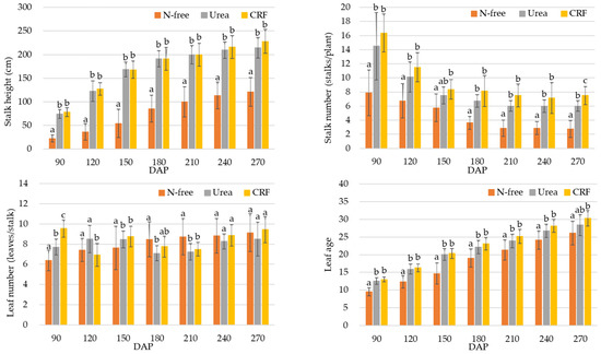 Variation in stalk height, stalk number, leaf number, and leaf age of ratoon. Bars represent standard error. Different letters indicate significant differences in measured growth parameters in DAP-wise related to different fertilizer applications obtained from ANOVA with LSD multiple range test (p < 0.05).
