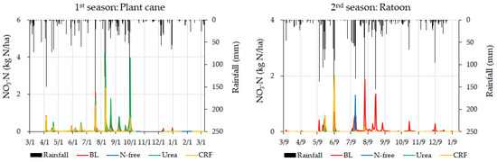 Nitrate-N leaching in all conditions in both crop seasons was sensitive to rainfall variation (Figure 7), resulting in increased nitrate-N leaching in heavy rainfall conditions. The cumulative nitrate-N leaching of the plant cane season for CRF, urea, and N-free treatments were higher than that of the ratoon season (Figure 8). The highest cumulative nitrate-N leaching was observed for urea treatment in the plant cane season and BL treatment in the ratoon season (Figure 8). However, except for urea treatment in the plant cane season, the BL condition recorded comparatively higher cumulative nitrate-N leaching than the other treatments in both crop seasons (Figure 8). In addition, cumulative nitrate-N leaching in urea application was higher than that of CRF application for plant cane while it was lower than that of CRF application for ratoon season (Figure 8).