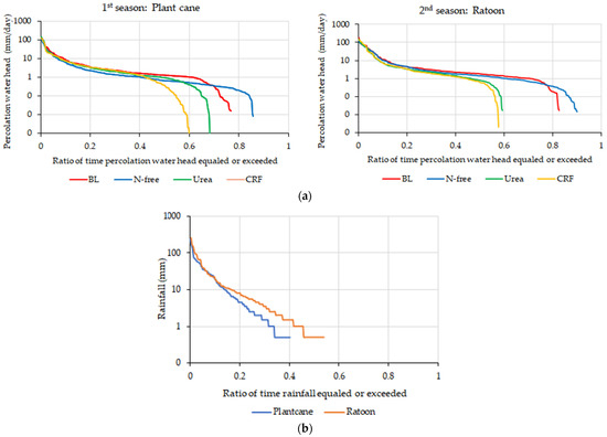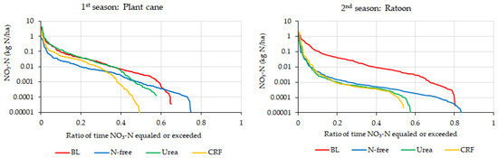 The variation in daily and cumulative nitrate-N leaching from lysimeters were different from each other. Nitrate movement through soil is closely related with physical, chemical, and biological properties of each particular soil. Generally, it is assumed that the application of fertilizers causes higher nitrate-N leaching. However, according to our results, the BL condition showed higher nitrate-N leaching in both crop seasons (except urea treatment in plant cane season), especially in the ratoon season (Figure 8). We considered the reason for the above phenomenon focusing on some points below, i.e., C:N ratio, infiltration, NHC, and N uptake by plants.