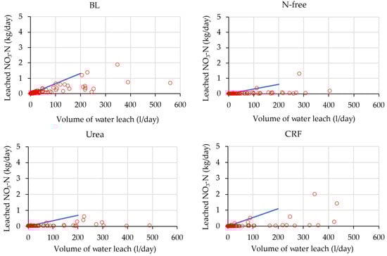 According to the measured total soil carbon (TCsoil) and total soil nitrogen (TNsoil) of the four lysimeters at a 0–30 cm depth during both crop seasons (Table 5), the average C:N ratio of the four lysimeters was 10:1 during the experimental period. According to USDA-NRCS [52] and Swangjang [53], the C:N ratio of available substances in and on the soil can significantly affect crop residue decomposition. Brust [54] stated that the rapid mineralization of organic matter and N release occurs when the C:N ratio of an organic substrate ranges between 1 and 15. Thus, a C:N ratio of 10:1 indicates that the decomposition rate of soil organic matter was fast and the availability of soil inorganic nitrogen was high. Therefore, we considered that the BL condition showed higher nitrate-N leaching than other vegetation-available conditions because the applied amount of fertilizer N—20 g/m2—was relatively small compared to the available TNsoil.