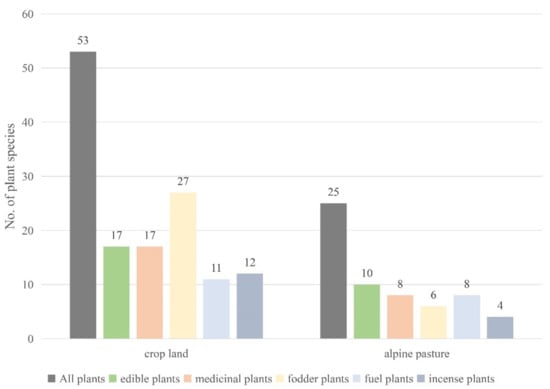 Our results show that Tibetans mainly collect wild plants from cropland and alpine pastures in the Kainali River Valley, Burang Town. Wild plants from alpine pastures were far less than those collected from croplands (Figure 3). This is not consistent with previous studies showing that as altitude increases, the number of useful plants decreases [56,57,58]. For example, with the exception of field vegetation, the species richness of all-use plants, edible plants, and medicinal plants used by the Lhoba decreased with increasing altitude [35]. Although there are fewer useful plants at higher altitudes than at lower altitudes, useful species (mainly medicinal plants) account for an average of 61% of the overall species richness, and the proportion of useful plants at different altitudes remains largely invariable [59].