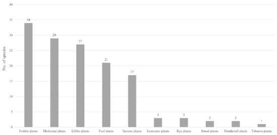 Of 76 wild plant species in total, many plants have multiple uses, and 57.9% (44 species) of these plants belonging to two to five use categories. These plants are used to meet the daily product and service needs of by the Burang Tibetans. Our results showed that there were 26 edible plant species, 29 medicinal plant species, 34 fodder plant species, 21 fuel plant species, 17 incense plant species, three economic plant species, three dye plant species, two ritual plant species, two handicraft plant species, and one tobacco plant species (Figure 4).