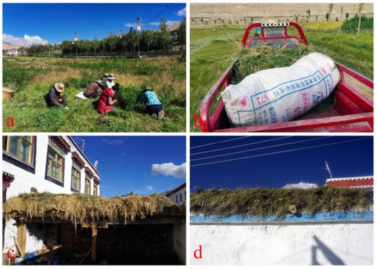 The process of fodder gathering. (a): Harvesting fodder; (b): shipping fodder; (c,d): drying fodder.