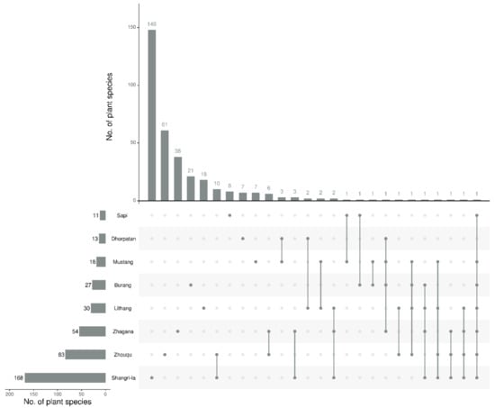 Comparison of plants used in eight regions. The bar chart on the left shows the original number of wild edible plants used by Tibetans in different regions; dot refers to the corresponding region name on the left in the intersection below; the connection between dots indicates that Tibetans in different regions jointly use some wild edible plants; upper histogram represents the number of plant species at this intersection.