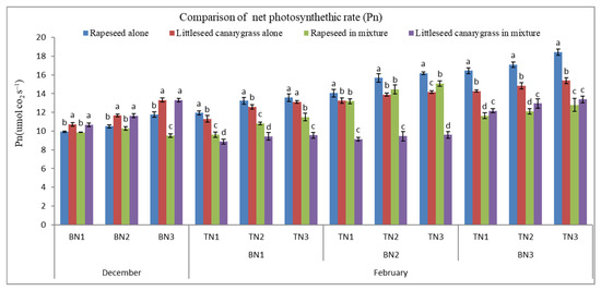 The effects of different nitrogen regimes on net photosynthetic rate (Pn) of rapeseed and littleseed canarygrass in December and February. Bars are means ± standard error, and different letters represent significant differences under the same nitrogen condition at p < 0.05. The same below.