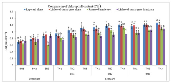 In December, net photosynthesis rate (Pn) and chlorophyll content (Chl) of littleseed canarygrass were significantly higher than those of rapeseed (p < 0.05) in either monoculture or mixed culture (Figure 1 and Figure 2). With the increasing N application rates, the Pn and Chl of littleseed canarygrass increased; however, Pn and Chl of rapeseed first increased and then decreased in the mixed culture treatment. Although the Pn and Chl of rapeseed or littleseed canarygrass in mixed culture were lower than these parameters in monocluture, there were generally no significant differences for either species. However, for BN3 treatments, the mixed culture rapeseed exhibited significantly lower Pn and Chl levels by comparison to the other treatments (Figure 1 and Figure 2).