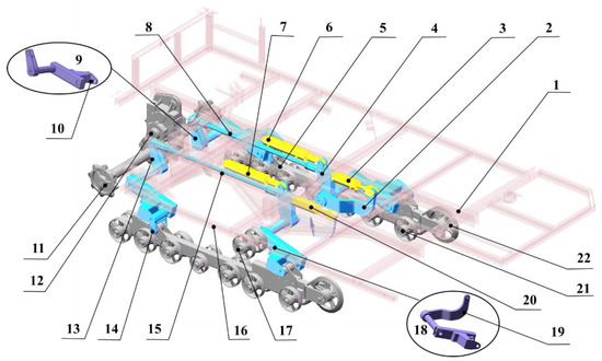 Detailed structure of the attitude adjustment mechanism: (1) chassis frame, (2) right rear oscillating arm assembly, (3) right rear hydraulic cylinder, (4) right rear pivot arm, (5) right walking beam, (6) right front hydraulic cylinder, (7) left front hydraulic cylinder, (8) right connecting rod, (9) right front oscillating arm assembly, (10) right connecting arm, (11) driving wheel, (12) gearbox, (13) left front oscillating arm assembly, (14) left connecting arm, (15) left connecting rod, (16) left walking beam, (17) track roller, (18) left rear oscillating arm assembly, (19) left rear pivot arm, (20) left rear hydraulic cylinder, (21) thrust wheel, (22) tensioner.