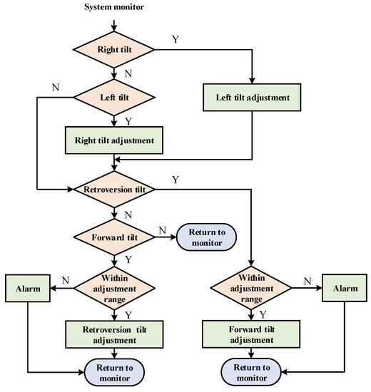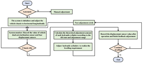The main working procedure of the adaptive leveling system is shown in Figure 3. A double-axis inclination sensor (Model: MQJS30V1CC, Shenzhen Miran Technology Co., Ltd., Shenzhen, China) is fixed under the chassis frame, with a frequency of 100 Hz and measurement accuracy of 0.05°, for periodic measurement of vehicle body lateral and longitudinal roll angles. Vehicle attitude then could be obtained by an inclination sensor, and the required displacement could be calculated through a controller on the basis of the input inclination information. The relevant PWM signals are controlled to adjust the action hydraulic cylinder, and feedback adjustments are then conducted according to real displacement monitored through displacement sensors (Model: WY-01-100, Shenzhen Miran Technology Co., Ltd., Shenzhen, China).