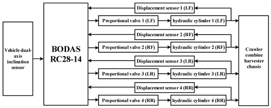 The structure of the control system is shown in Figure 4. The BODAS RC28-14 (Model: RC28-14, Bosch Rexroth, Lohr am Main, Germany) controller is the core of the whole control system. The hardware part includes a double-axis inclination sensor, a proportional directional valve and displacement sensors. BODAS RC28-14 is responsible for the communication, sensor integration and calculation of the hydraulic cylinder displacement. The inclination sensor and displacement sensors are powered by the controller and the analog output parameter can be connected with the controller directly through the I/O port. The electrohydraulics are designed to conduct adjustments, and each adjustment action could be driven by four double-action hydraulic cylinders. The hydraulic, one-way valves are set at each oil inlet and outlet of the hydraulic lock and thus prevent insufficient support stiffness.