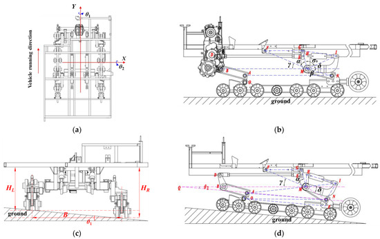 Currently, vehicle leveling technology has received increasing interest from researchers. The active suspension of vehicles can adjust dynamically and adaptively according to the motion state and road condition of the vehicles and improve the trafficability by controlling the body height. Sarel et al. [17] used slow active suspension control to reduce body roll so as to reduce the possibility of rollover tendency in the case of lane change and sudden change in vehicle conditions. Sun et al. [18] controlled the vehicle height by fuzzy sliding mode controller (FSMC) and adjusted the vehicle’s heeling and pitch angle through the EAS system, which effectively guaranteed the vehicle height adjustment performance. In the field of special vehicles, the Mars rover Zhurong designed by Pan et al. [19] realized the functions of peristaltic wheel walking and horizontal lifting of the vehicle body by using the active suspension system, which solves the problems of a low climbing angle of the planetary vehicle mobile system in soft terrain. Sun et al. [20] studied a posture adjustment mechanism based on a parallel four-bar mechanism, and key components were analyzed in ANSYS software to meet strength requirements, while it could only complete the lateral level. Edlund et al. [21] designed a new type of bogie to level the operating components to improve the ability of forestry vehicles when traveling on rugged and soft soils.