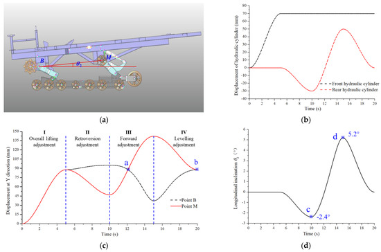 When the overall lifting and pitching of the chassis is adjusted (the forward tilting of the chassis in the simulation is shown in Figure 9a), points B and M can reflect the changes in the lifting height and pitching tilt angle of the chassis. Figure 9b shows the displacement of the hydraulic cylinder; Figure 9c shows the displacement change in point B and point M in the Y-direction; Figure 9d shows the change in longitudinal inclination.