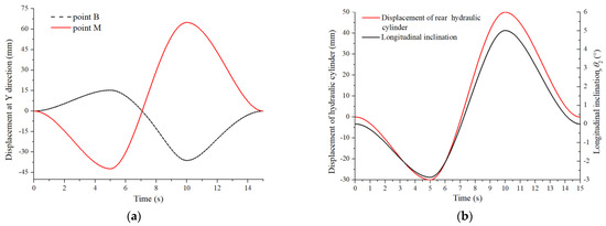 When the chassis is at the lowest position for longitudinal adjustment, Figure 10a shows the displacement of points B and M in the Y-direction, and Figure 10b shows the displacement of the rear hydraulic cylinder and the change in the longitudinal inclination.