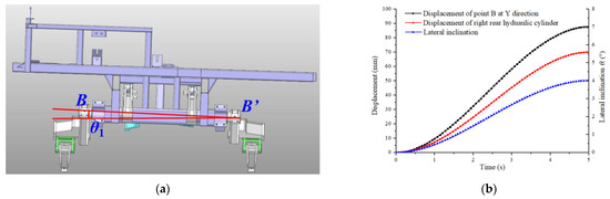 When conducting lateral tilt adjustment (Figure 11a shows the left tilt of the chassis in the simulation), point B on one side is lifted so that point B can reflect the change in the lateral tilting angle. Figure 11b shows the variation curve of various parameters in the simulation results. From 0 to 5 s, the right front hydraulic cylinder gradually extends 70 mm, point B is raised by 87.8 mm and the maximum lateral adjustment angle of 3.98° is reached. The simulation verified that by adjusting the front hydraulic cylinder on one side, the lateral tilt adjustment of the vehicle can be achieved.