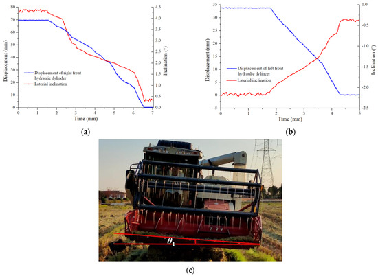 The experiment started when the chassis was in the lowest level position, we manually adjusted the vehicle to the extreme left tilting state and then turned on the automatic leveling switch. Figure 13a shows the auto-leveling process, and Figure 13c shows the horizontal leveling test diagram. Within the first 1.5 s, the attitude sensor detected the vehicle’s inclination state, and the required adjustment displacement of the hydraulic cylinder was calculated. After measuring, control of the opening of the proportional valve where the corresponding hydraulic cylinder was located. Since the vehicle tilts to the left by the extension of the right front hydraulic cylinder, the extension of the hydraulic cylinder was at its maximum limit at 0 s, and the vehicle was tilted to the left by about 4.25°. Within 5 s, the front right hydraulic cylinder gradually contracted, and the lateral inclination angle of the vehicle body also gradually decreased. After about 6.5 s, the hydraulic cylinder contracted to the initial shortest state, at which time the vehicle remained horizontal.