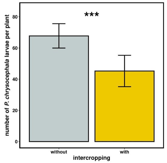 Intercropping Brassica napus reduces the number of Psylliodes chrysocephala larvae in plants when Vicia faba did not freeze over winter. Average number of P. chrysocephala per control (gray) and intercropped (yellow) B. napus. Bars represent SEM; *** indicates p-values < 0.001.