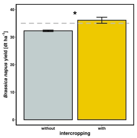 Intercropping supports Brassica napus yield when Vicia faba did not freeze over winter. Average yield of control (gray) and intercropped (yellow) B. napus. The dashed gray line represents the average Swiss B. napus yield for the same growing season. Bars represent SEM; * indicates p-values < 0.05.